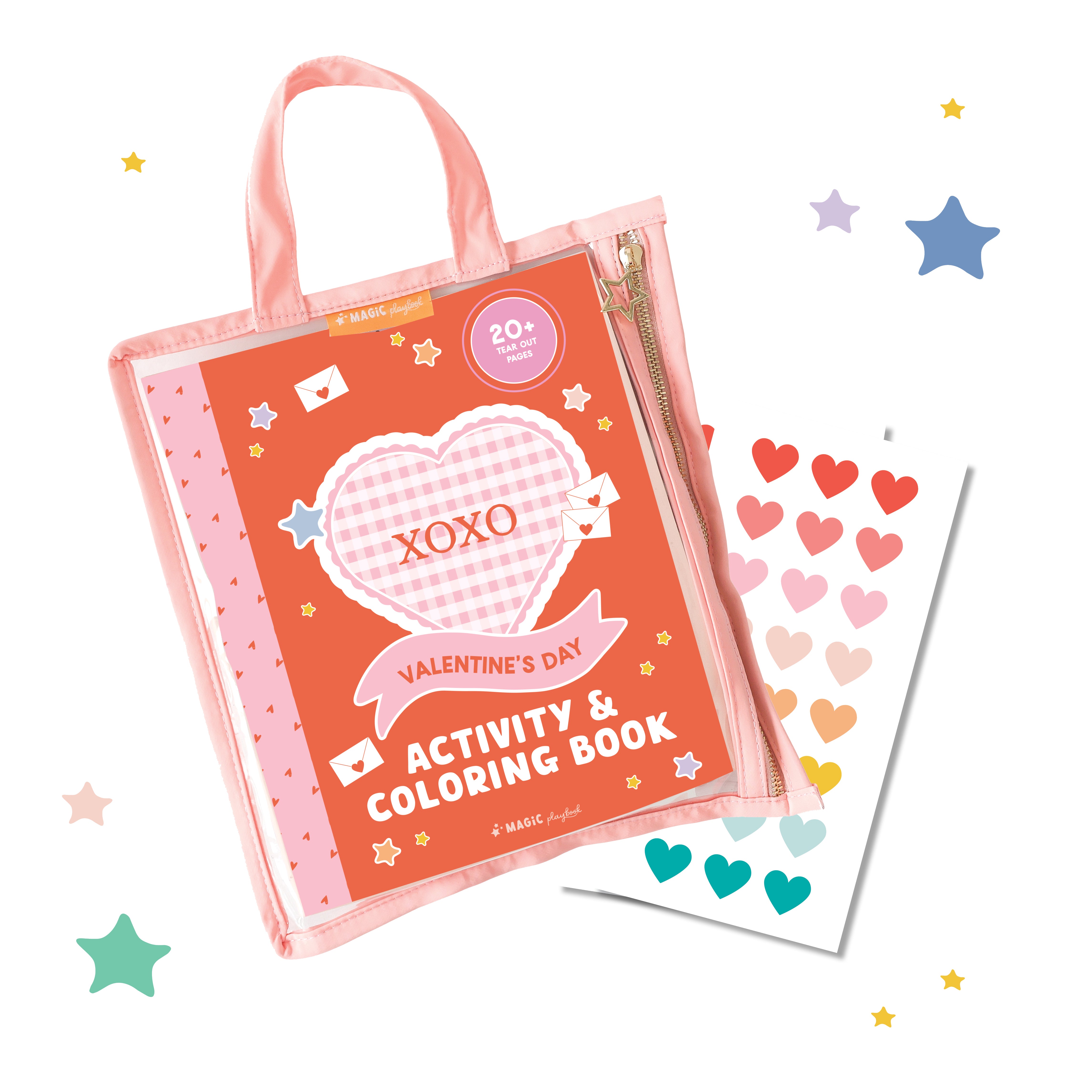 Introducing the Valentine's Dot Kids On-the-Go Activity Kit! This charming set offers 25 full-color perforated pages filled with endless creative possibilities. With 10 sheets of dot stickers included, your child can decorate, color, and craft to their heart’s content—anywhere, anytime. The reusable zippered pouch with handle makes cleanup easy and play portable.